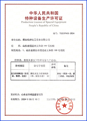 松嶺化工專注化工設備行業15年,集科研、開發、設計、 生產于一體的高新技術企業,還具備設計、制造D1、D2類壓力容器資質。質量保障